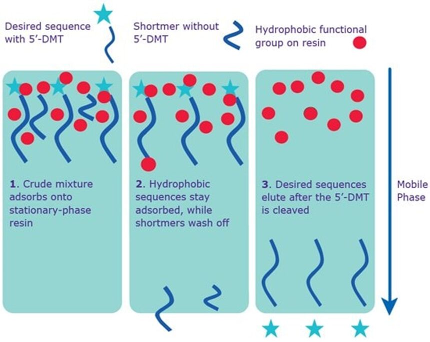 Các mẫu oligo cần tinh sạch sẽ được nạp vào cột có chứa các pha tĩnh mang nhóm chức kỵ nước, lúc này các trình tự có kích thước đầy đủ và có chứa nhóm 5’-DMT kỵ nước (Đoạn thẳng có gắn ngôi sao như hình 3) thường có liên kết mạnh với cột nên các trình tự oligo có kích thước chính xác sẽ được giữ lại trên cột, trong khi đó những trình tự lỗi có kích thước ngắn sẽ bị rửa giải sớm hơn. Sau đó sẽ tiến hành loại bỏ nhóm DMT và rồi tiến hành thu nhận trình tự oligo mục tiêu.